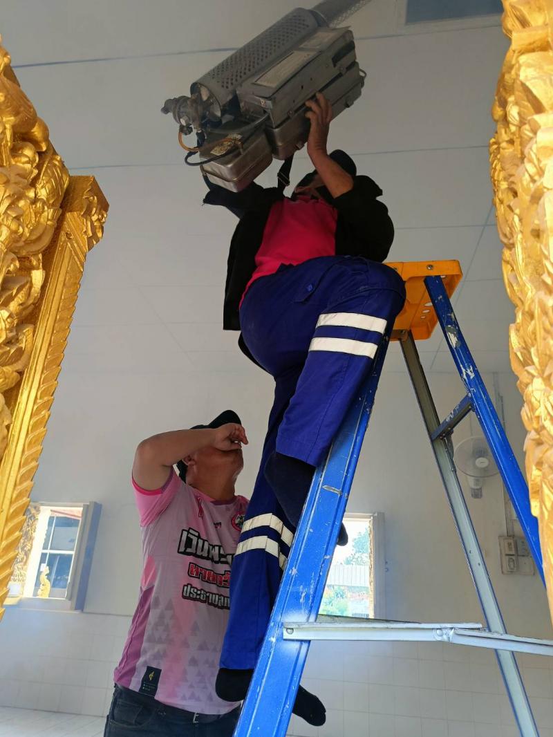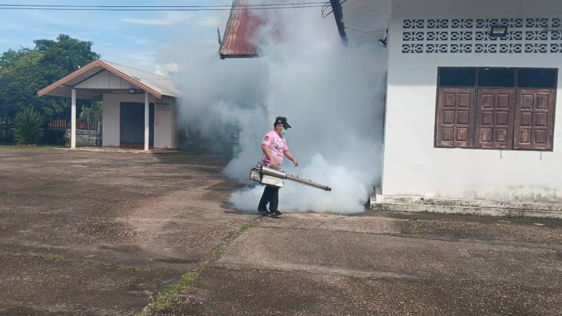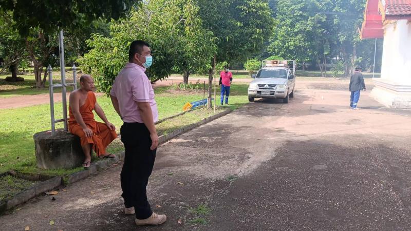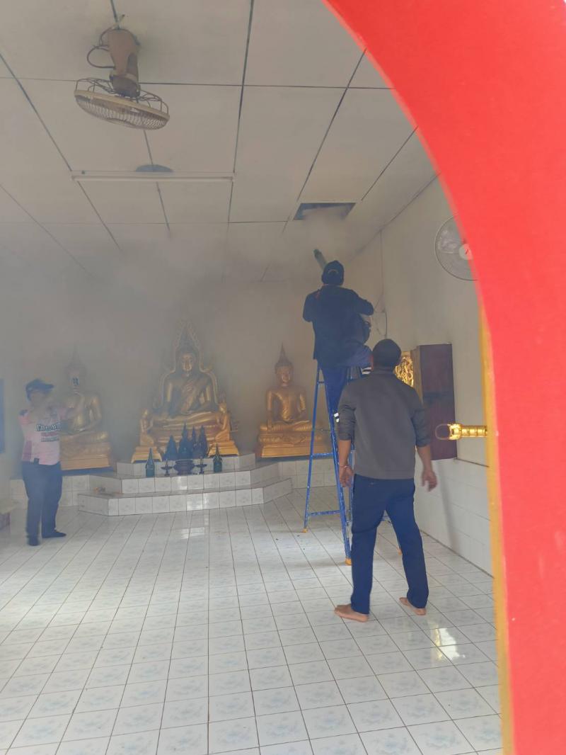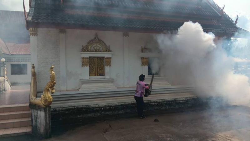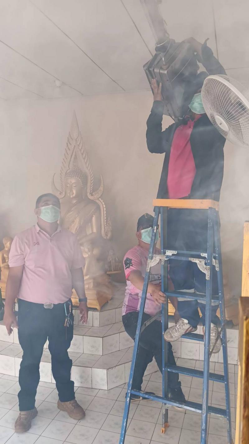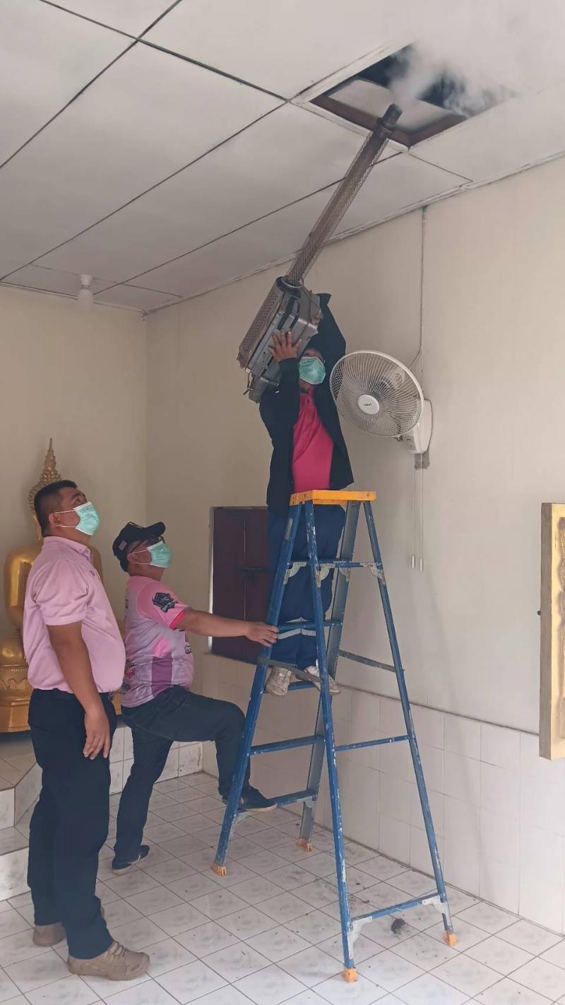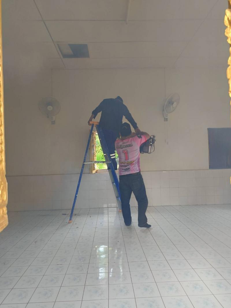 งานป้องกันฯร่วมกับกองสาธารณสุขออกฉีดพ่นหมอกควันไล่ค้างคาว วัดศรีมงคล หมู่ที่ 6 บ้านนาสีดา