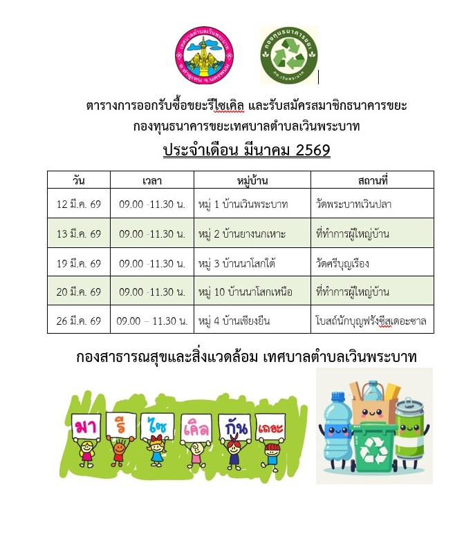 กำหนดการออกรับซื้อขยะรีไซเคิล ประจำเดือน มีนาคม 2569 กองทุนธนาคารขยะตำบลเวินพระบาท